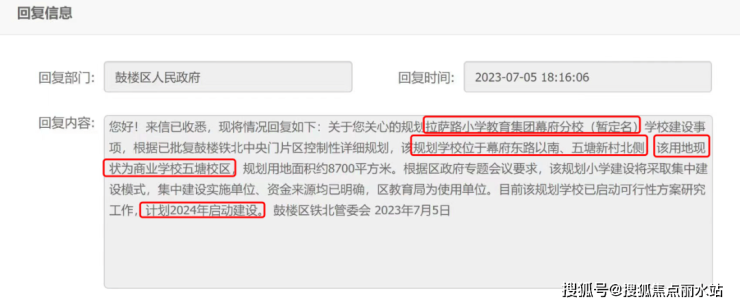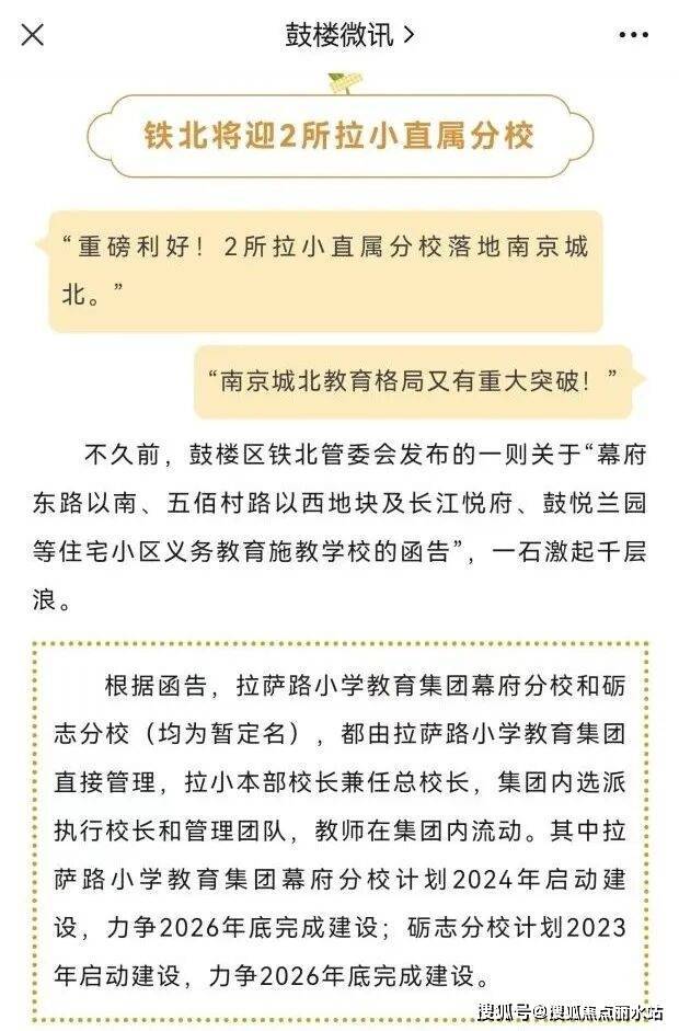 其实在今年4月,官方就确定了未来长江悦府、鼓悦兰园的学区,就是拉小分校。据鼓楼微讯:拉萨路小学教育集团幕府分校,由拉萨路小学教育集团直接管理,拉小本部校长兼任总校长,集团内选派执行校长和管理团队,教师在集团内流动。学校计划2024年启动建设,力争2026年底完成建设。将作为长江悦府等住宅小区为义务教育施教学校。