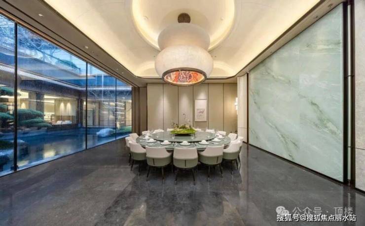 约63米的恢弘大门,整体形制取自宋代名画《仙山楼阁图》的五间一启门,大门两侧,威严的石雕麒麟与两株百年罗汉松,共同营造出气度非凡的祥瑞意境。同时璟园采用蓝翡翠奢石、艾伦蓝奢石等数种珍稀石材,赋予建筑以全新的生命力。