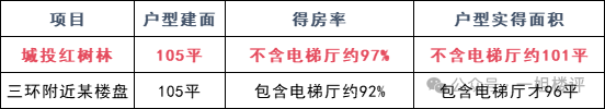 在这里,没有比较就没有伤害。跟汉口三环附近某楼盘相比,同样是建面约105平户型,三环附近楼盘加上电梯前厅才有约92%的得房率,综合使用面积也就96平左右。