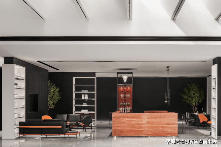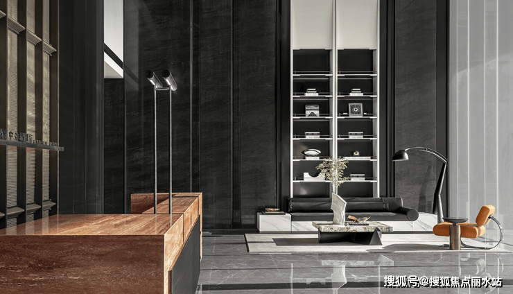 接待前厅采用特殊肌理的红洞石和深色皮革组合拼接,材料叠用经过灯光过滤与折射下增添了几分精致感,整个空间营造出精品酒店式城市会客厅的时尚气质。
