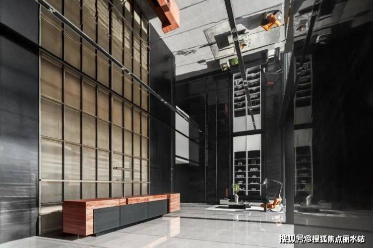 6米高的前厅为室内拉开了“奢居”的序幕,红洞石与金属的结合使空间更加富有层次与品质感。室内整体运用深色材质营造静谧的空间氛围,使人更加沉浸的享受与放松。在内部空间中,始终遵循模糊边界的设计理念,通过大面积玻璃幕墙与开放的墙体形成室内与室外相互共同,强化空间的联动性与趣味性。