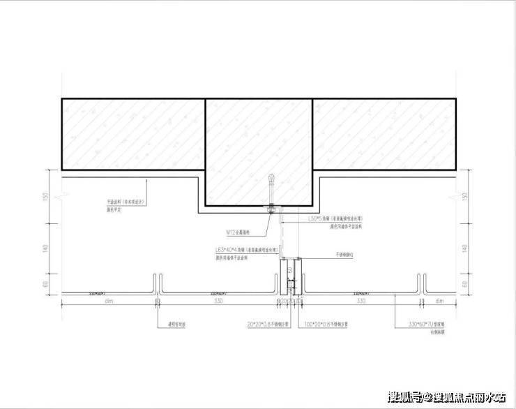 建筑立面采用蜂窝不锈钢板+泥客石的材料。设计对幕墙节点反复推敲,为了实现简洁、一体化的立面效果,所有石材及不锈钢板均采用密拼的方式。因不锈钢面板尺寸较大,为了保证平整度设计与工程充分拉通,尝试多次工艺做法后,最终采用钢骨架+蜂窝不锈钢(2.0mm面层+20mm铝蜂窝+1.5mm镀锌铁皮背衬)的构造做法。