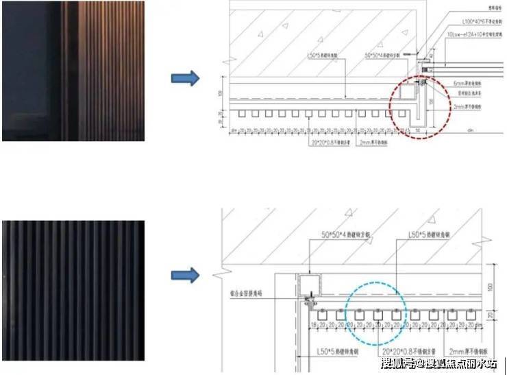建筑入口吊顶天花板采用密拼2mm厚拉丝不锈钢板钢,左右采用宽缝20mm,并间隔设置灯带,室内吊顶与挑檐吊顶做齐,增加整体性,延续纵深感,使立面更挺拔、更现代,打造精品酒店大堂的既视感。