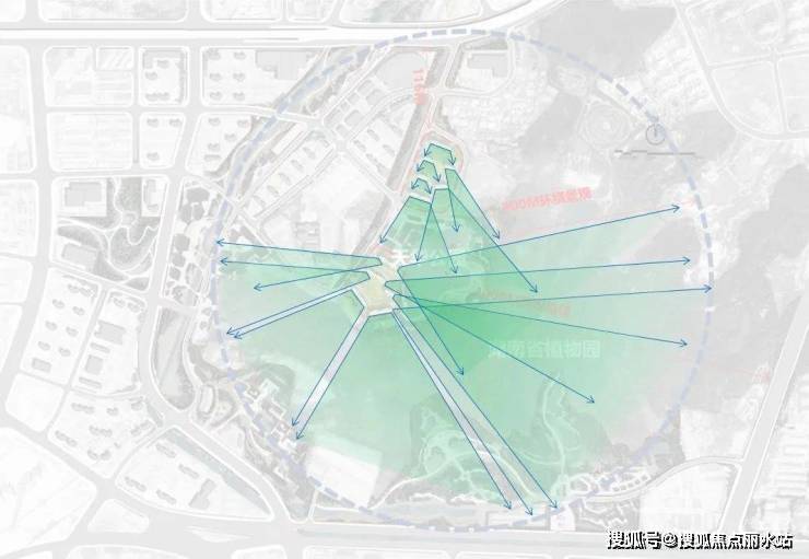 项目分为南北两个地块,北地块距离城市主路及红星商圈仅300m,东侧及南侧享受植物园半径900m,270°环绕景观。东侧正对1200m长景观通廊。设计的第一个重点,就是营造“出则繁华、入则宁静”的极致体验。
