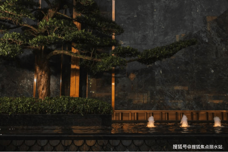 「笔墨门庭」处,宽约58米恢宏主入口,以酒店式落客空间迎宾,彰显归家的尊崇感。形似莲花的聚宝盆水景静卧其中,盆景罗汉松、黑松与蓝钻奢石景墙相映成趣,刚柔并济,寄托福泽绵长的美好寓意。