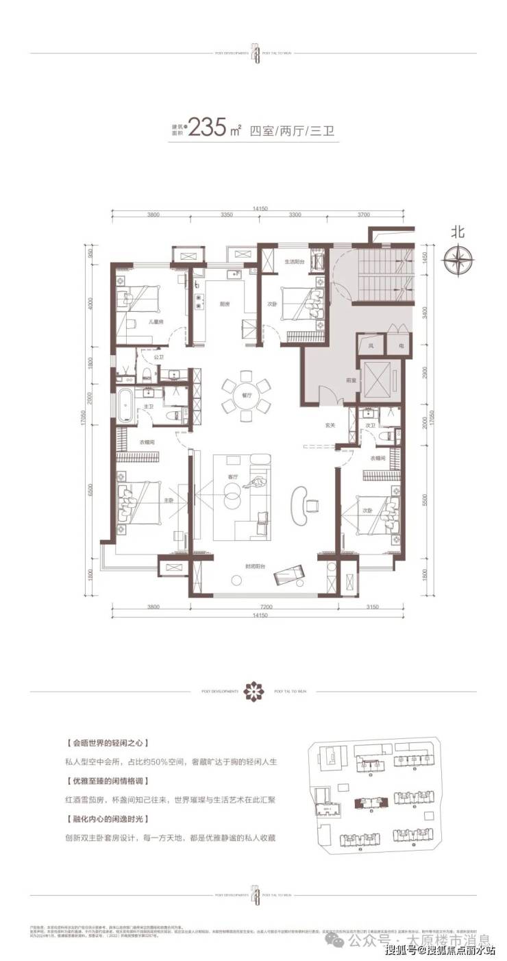 户型:230平米、235 平米两种,楼栋总高28层,公摊19.7%
