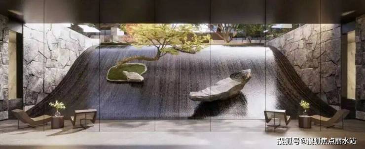 其三,引南通军山飞瀑为灵感,打造约16米宽、5米落差的社区悬瀑主景。瀑间点缀铁冬青,瀑脚设大师手工凿刻的舟石与闲台,不止为视觉震撼,更为传递“何处江山不自由”的从容心境;