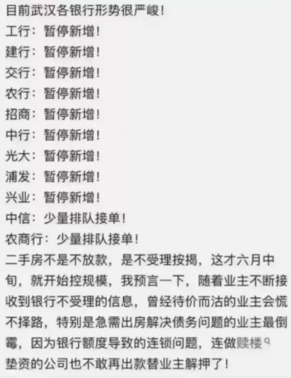 除了以上城市,还有武汉。农业、交通、招商、上海浦东发展、光大等大型银行开始停止对二手房贷款!