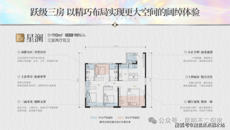 1、【星境】高实用三室两厅双卫建面约95㎡,得房率约96%