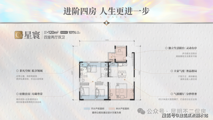 3、【星寰】超大面宽四室两厅双卫建面约120㎡ ,得房率约101%