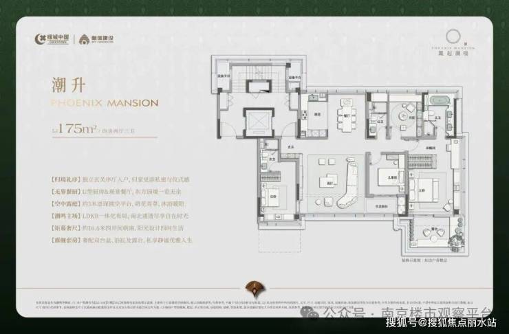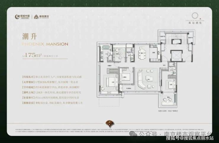建面约175㎡四房两厅三卫:有约3米进深的挑空平台,约16.6米四开间朝南,U型厨房&观景餐厅,东方园境一览无余。