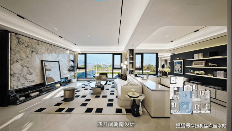 四开间朝南设计,南向双套房。客厅同样可改大宽厅,餐厅摆下圆桌和餐边柜外还有充足的活动空间,完全媲美150+大平层体验。