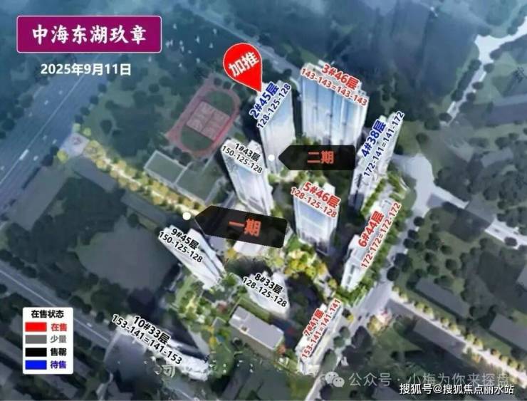 中海·东湖玖章共分两期开发项目总占地约53685㎡,建面约217000㎡,容积率约4.04,绿化率30%,总户数1353户,车位1755个,车位配比1:1.3,物业费3.2元/㎡·月,项目共规划了10栋33-45层,高层/超高层住宅分2期开发,地块需要配建一所九年一贯制学校、一所幼儿园。一期包含1、7、8、9、10号楼共622户,预计2026年6月30日精装交付;二期包含2、3、4、5、6号楼共731户,预计2026年11月30日精装交付。