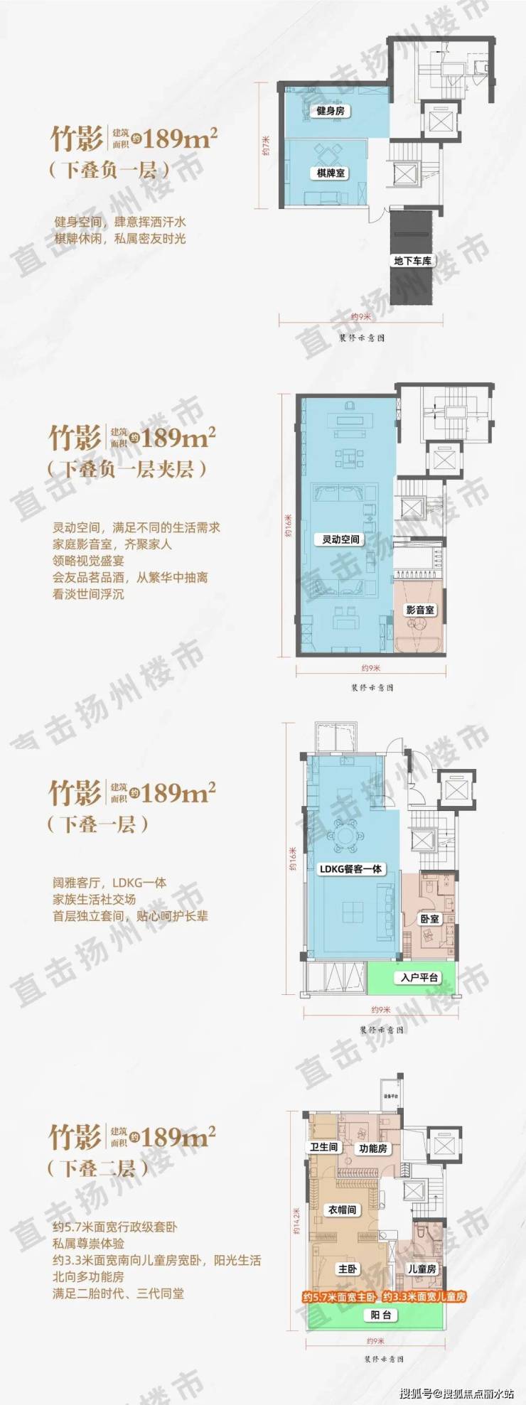 建面约189㎡下叠:地下室可以做出两层生活空间,一层LDKG一体客厅,二层约5.7米面宽行政级套卧,约3.3米面宽南向次卧。