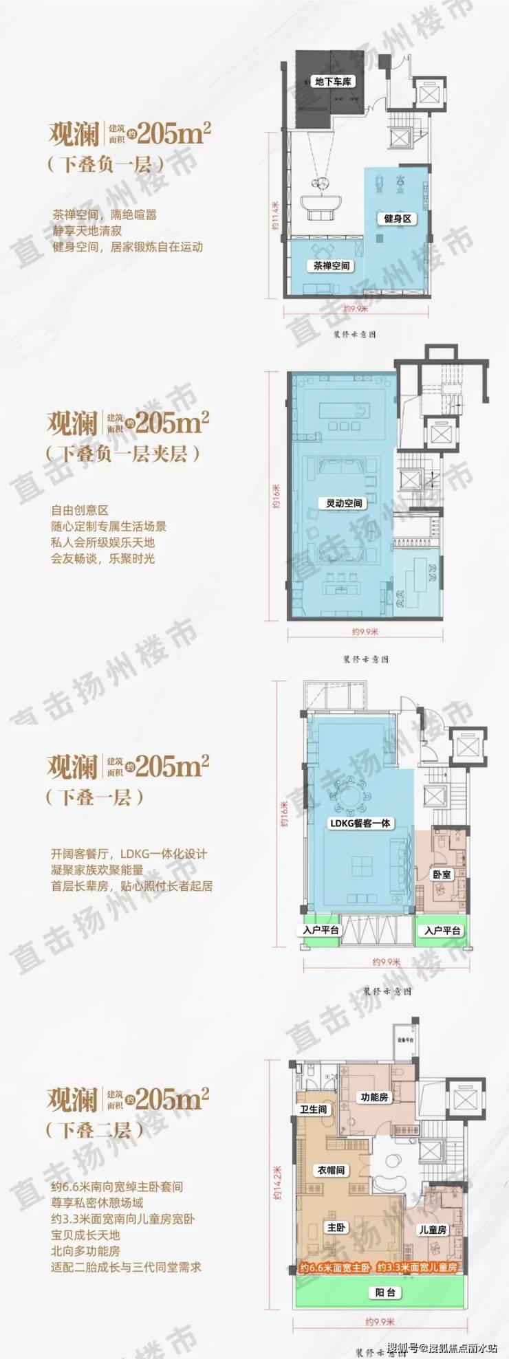 建面约205㎡下叠:挑高地下室,可以打造私人会所级的休闲天地,LDKG一体化设计,首层长辈房,二层约6.6米南向宽绰主卧套间,以及南北次卧,适配二胎或三代家庭。