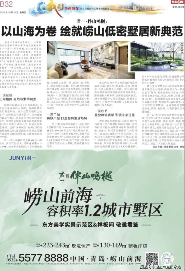 在崂山前海的金色岸线上,一座融合自然禀赋与城市繁华的低密墅居作品——君一·伴山鸣樾,正以全新姿态启幕青岛高端人居的新篇章。
