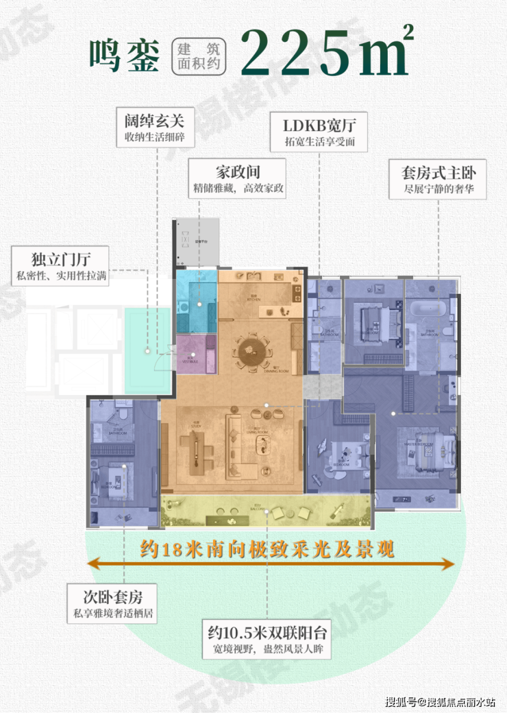 户型具备稀缺的产品形态。南向观景面宽18米,四开间朝南,LDKB一体化设计。