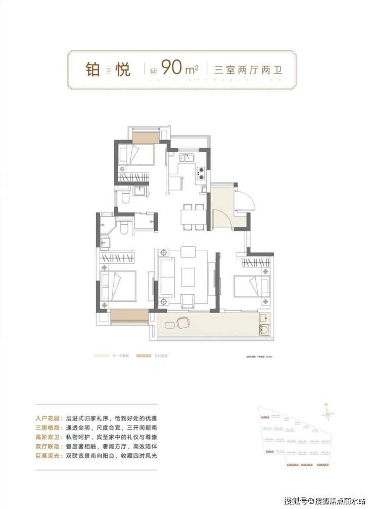 建面约90㎡三房两厅两卫:呈现出高层超建面约100㎡户型的空间感,入户花园+餐客厅一体化+三开间朝南+南向双阳台+观景飘窗+双卫,非常适合首置家庭。