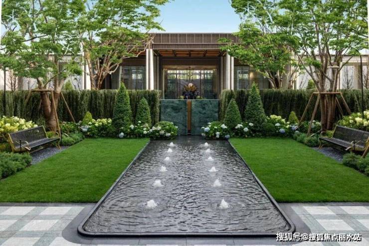 景观设计上,采用了轴线对称布局,营造出强烈的礼序感,体现法式建筑的庄重与优雅。中轴对称分布的迎宾水景,搭配精致雕塑,水声潺潺,增添归家的仪式感与浪漫氛围。