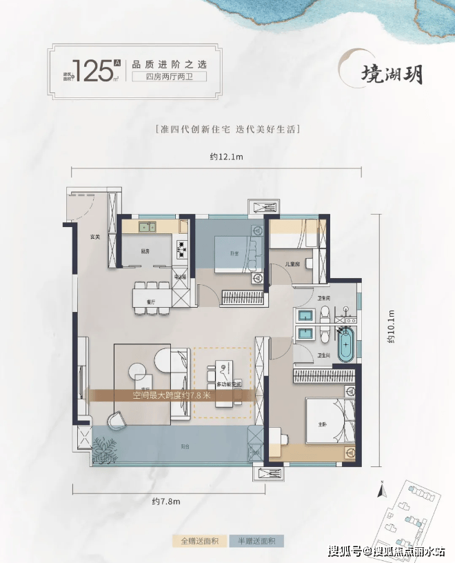 建面约125平的户型,优化后实得套内面积可达约116平以上,相当于三代住宅建面约145平以上的户型。