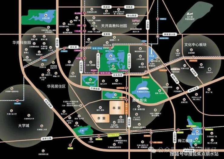 【区域配套】:南开奥体板块,坐享天津高端商圈崛起与成熟豪宅区;周边配套资源优势突出,四大公园环绕,交通,商业,九年一贯制学校(规划中)及医疗等配套成熟。
