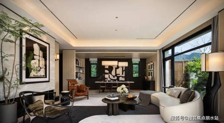 借建筑设计低矮体量与多重院落,将山林光影、庭院景致大面积引入室内。室内设计以富春山水为色谱,选用温润木材、天然石材、细腻织物,营造宁静、内敛、触感丰盈的“小隐于市”之境。