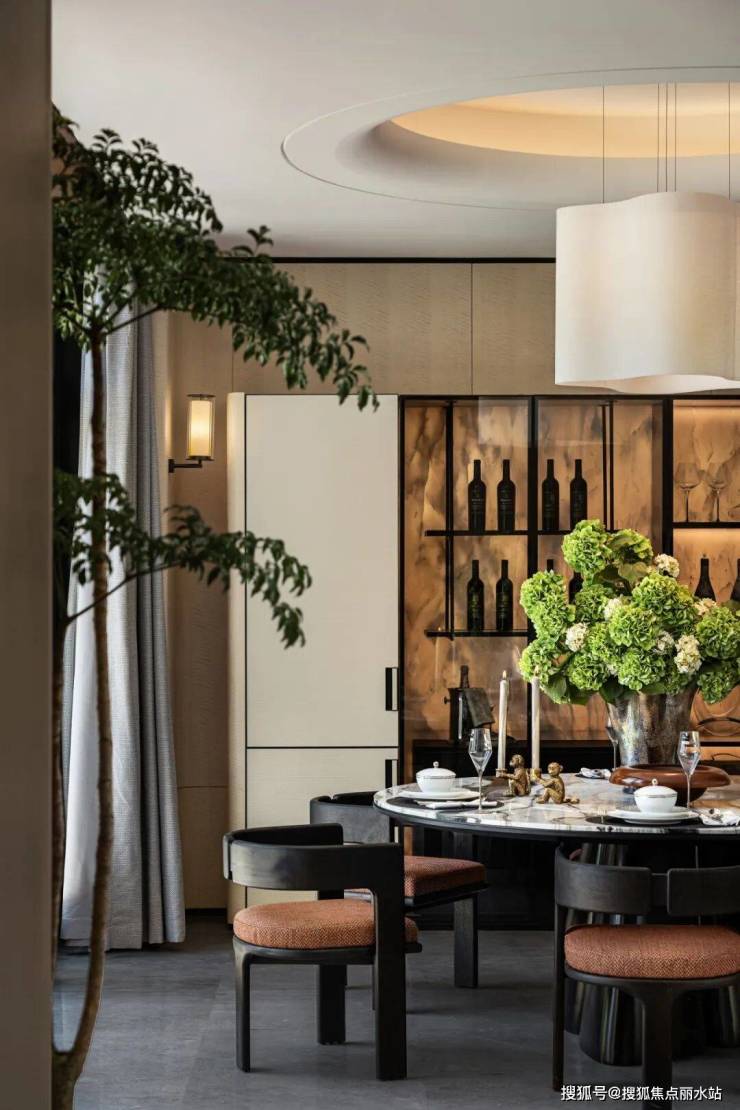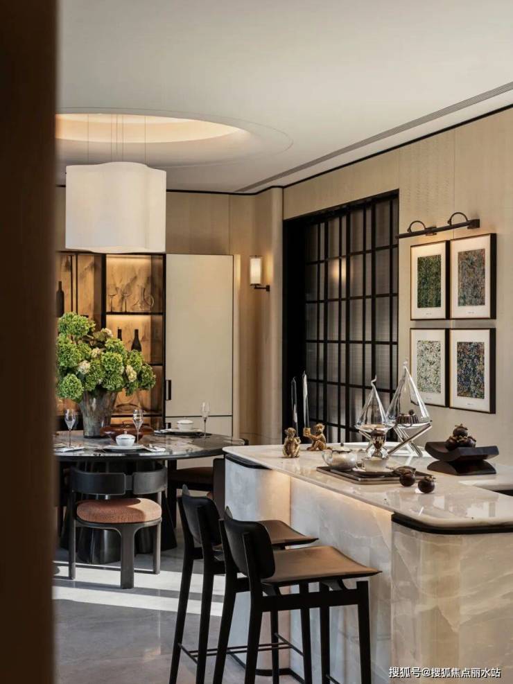 家庭餐厅位于一层,以圆餐桌为核心围合大家庭的凝聚,桌体石材具有水墨自然的肌理,搭配温润的木质餐椅。餐边柜采用发光玉石与复合材料组合,如同一件艺术品陈列于此。