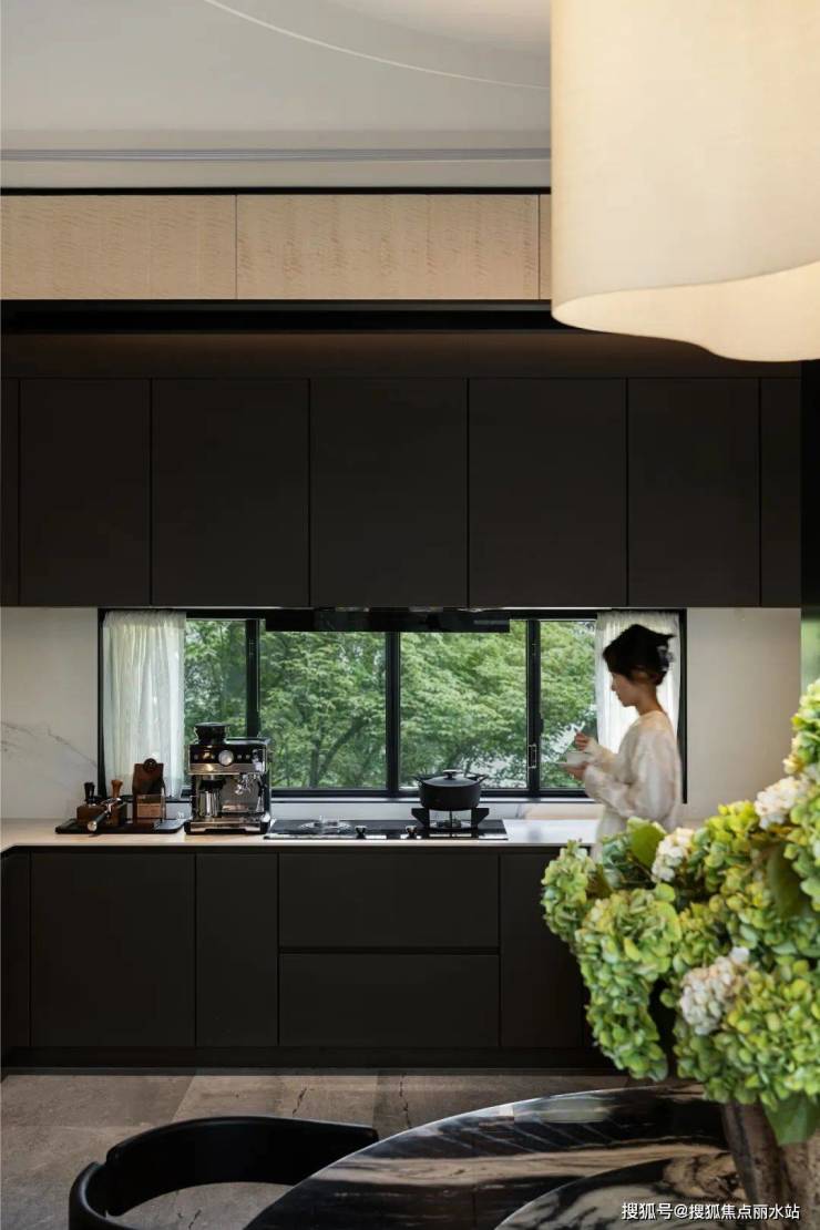厨房操作台正对外侧庭院,洗切备餐时可观赏到室外树林的晨昏光影。西厨中岛衔接备餐动线,温酒器、醒茶台触手可及。