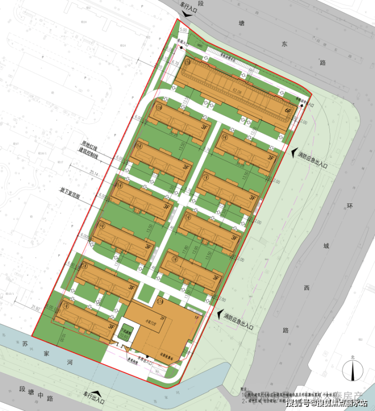 地块总用地面积13230m²,总建筑面积约28248m²,容积率约1.1,建筑密度约40%,绿地率约30%。地块规划10幢3F、1幢6F共计11幢住宅。