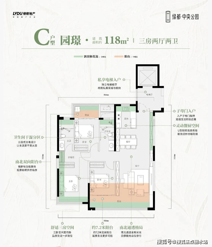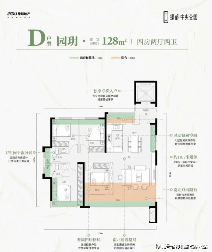 私享电梯前室,增加收纳空间和归家仪式感。这个户型还是南北双阳台设计,客餐厅LDKG一体化。