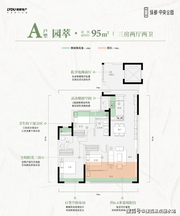 建面约95平米,三房两厅两卫。