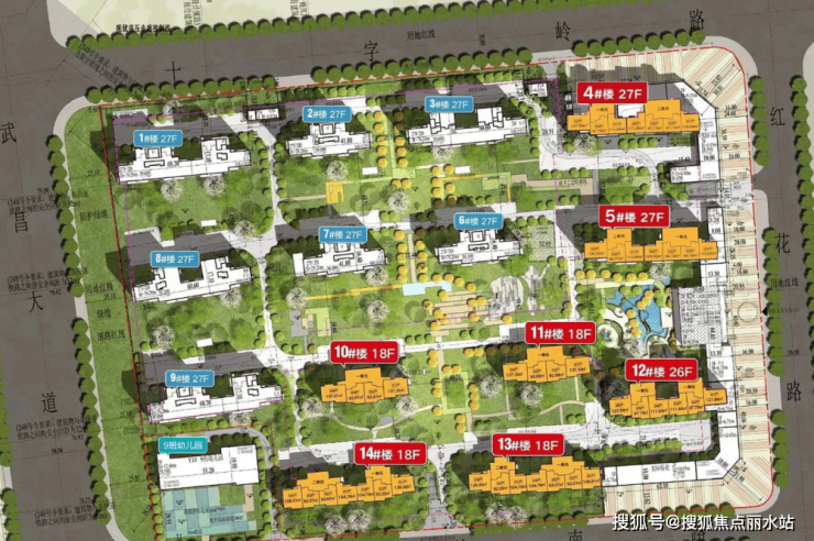 一期是红色标注部分,包含4、5号楼以及10-14号楼,共计7栋住宅;
