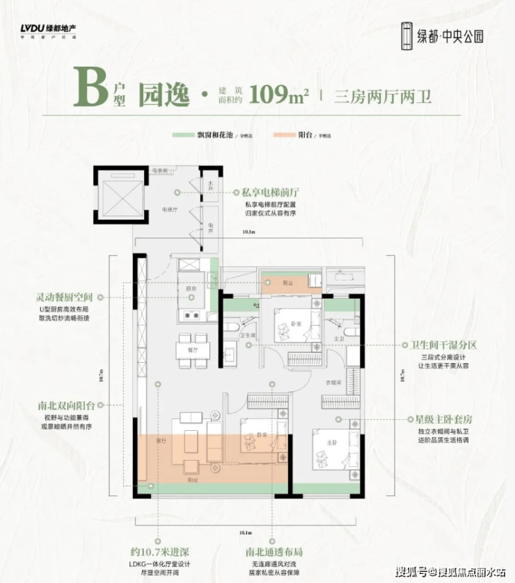 建面约109平,三房两厅两卫。