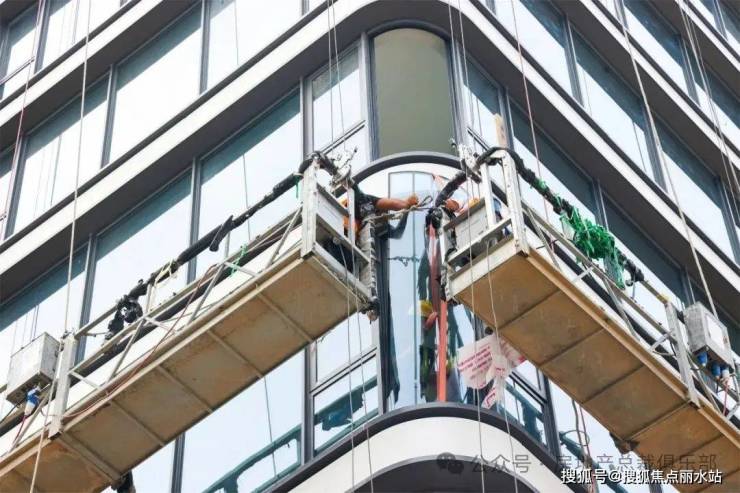 等弧形玻璃生产到位后,需要室外两名工人同时升起安装吊篮,与室内工人相互协作,同步施工,才能确保玻璃顺利安装到位。