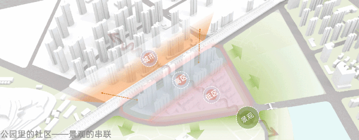 同时,视觉通廊将东西两端景观拉通,隔断城市界面对内部的干扰,两条轴线平面相交成T型,横轴两侧布置具有无遮挡湖景的北园高区,沿竖轴布置叠拼南园,安排两个环抱公园的全景低密组团,营造私属静怡宅院。