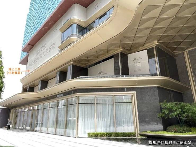 【公建立面】:首层石材,大面积落地玻璃搭配铝板线条