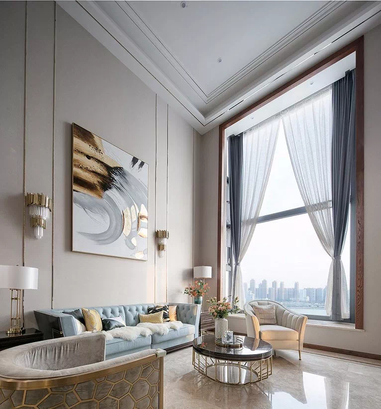 帘杆的安装位置大约在窗框上沿向上10CM~15CM,尽可能地营造出顶天立地的效果,在视觉上拔高空间;