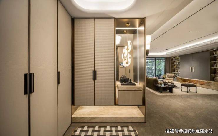 晓风明月的收纳系统,采用了十大高颜值美学设计:例如建面198㎡的玄关柜门,采用的是皮革门板+金属边框相结合的设计,建面168㎡的餐边柜采用奢石+珍珠鱼皮工艺,还有主卧衣柜门的夹丝玻璃,也是高端酒店同款……