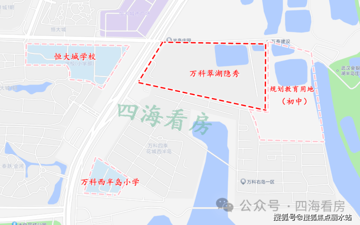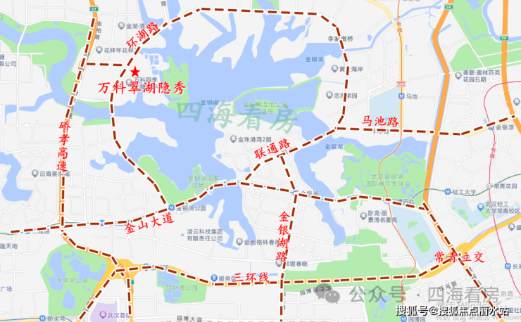 万科翠湖隐秀位于环湖路与新桥路交汇处,在楼市划分中属于金银湖环湖路板块,行政划分属于东西湖区。