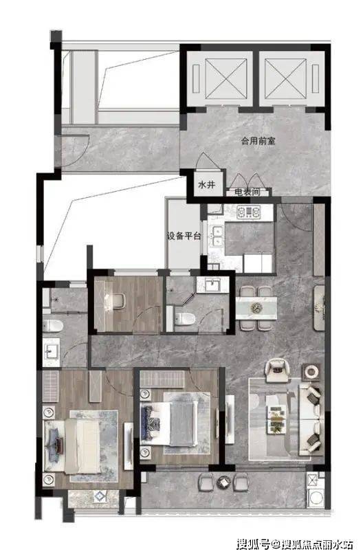 三房两厅两卫,两房朝南,格局与建面约98㎡户型相同。