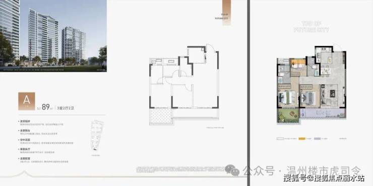 ①A户型:建筑面积约89㎡ 3室2厅2卫 全景阳台空中方庭 实用三房 友好总价小户 全景三阳台 空中花园 垂直纵厅 套房式主卧