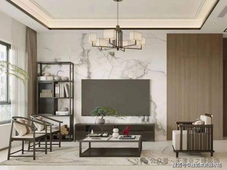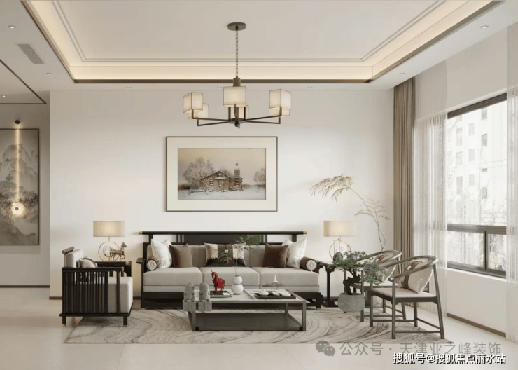 中央中式茶几与屋顶的中式线条灯带吊顶相得益彰,共同抒写东方情致。沙发背景墙悬挂一幅挂画,延续“景中有画,画中有景”的意境。