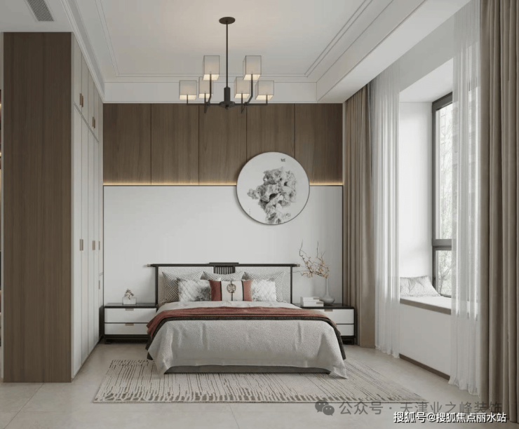 靠窗设置飘窗茶座,衣柜隔断设计,实用功能与美学表达并重。