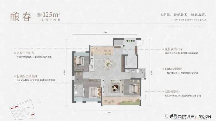 建面约125㎡的三房两厅两卫,是全封窗的准四代产品。
