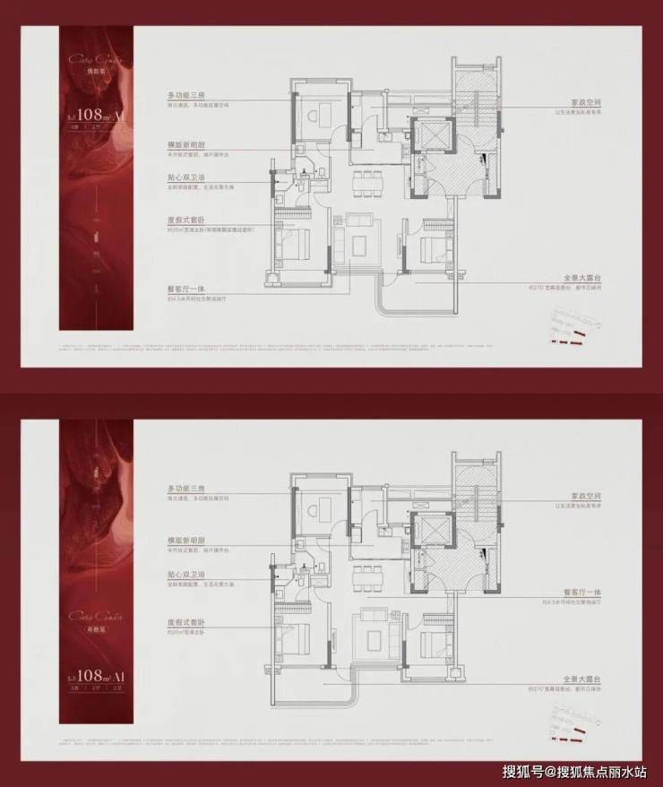 建面约108㎡户型,多功能三房产品,通过四代住宅创新设计,打造出超越面积限制的阔绰空间感,对比市面上大部分同面积户型,省去了过道部分,实现约100%实际空间使用率。