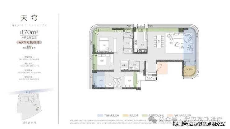 ③170㎡户型:四房两厅两卫,整个户型的布局与江面基本平行了,对比3号楼另外两个户型,170平户型的看江效果要优秀不少,客厅(270度观景)、主卧、主卫、厨房这几处空间都拥有不错的江景视野,观景面还是比较可观的。不过为了看江,这个户型的进深做的比较大,通透性稍显不足。
