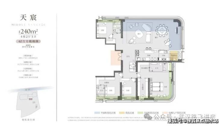 ⑤240㎡户型:四房两厅三卫,项目最大户型,不光观江视野最好,价格肯定也是最贵的。这户型南北通透,南边采光面挺宽,客厅是约12米的超级大横厅,还做了270度转角设计,能270度看江,就连旁边的主卧套房也能看江,能看江的地方特别多。不过选房源要注意,1号楼西边户旁边挨着写字楼,主卧看江的角度会受点影响,比起来还是东边户看江的角度更大些。