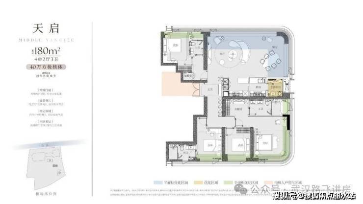 ④180㎡户型:四房两厅三卫,客厅、北向次卧拥有非常不错的看江视野,并且客厅可以270度观景;另外,东头这一户型的生活阳台、主卧套房也可以看江,观江面更大。但东头户型离3号楼较近,低楼层采光可能有所影响。