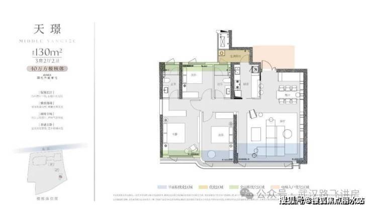 ①130㎡户型:三房两厅两卫,3号楼中间户,南北通透,三开间朝南;户型本身的布局还是比较方正的,并且有多处优化空间,厨房外还带一个生活阳台,可以用于后期晾晒,保留客厅阳台的纯粹性。但这一户型北面为连廊,加上客厅朝南设计,基本上没什么看江视野,主打优势是面积小,总价门槛低(项目内最低门槛)。