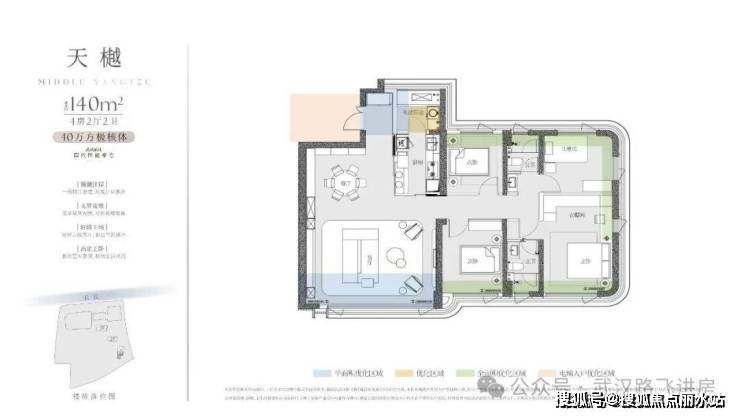 ②140㎡户型:四房两厅两卫,该户型南北通透、三开间朝南;因为3号楼的楼栋朝向、位置,属于北向看江,因此,这一户型的北面房间——次卧、儿童房拥有还不错的看江视野(中高楼层以上房源)。客厅空间相当的开阔,动静分区做的也比较好。售楼处电话400-8787-098接通后输入5678【营销中心】